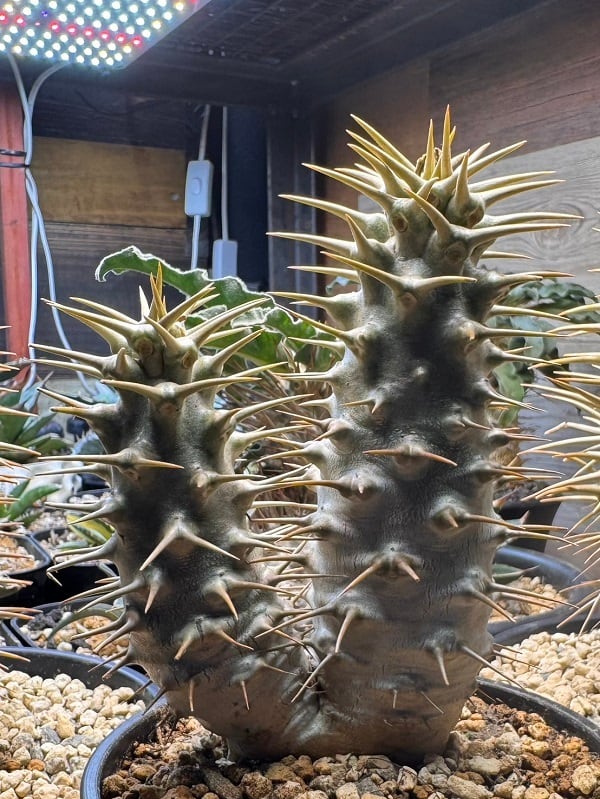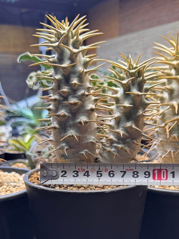 独特なフォルム姿に厳つい棘のアンバランス差がなんとも言えない表現をしており、パキポディウムの中でも希少な品種で成長するとフラスコ状の形になり、白肌色のとても綺麗な造形になります。